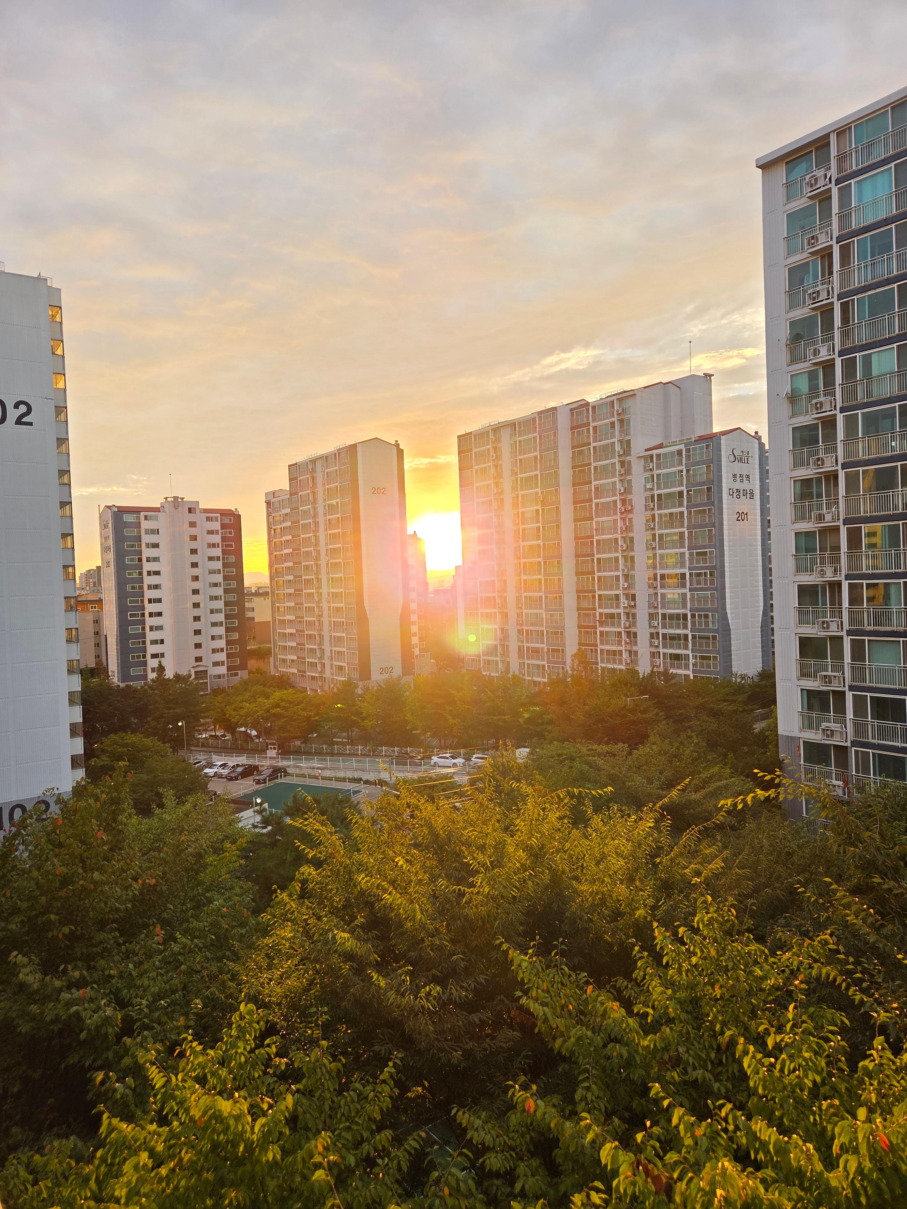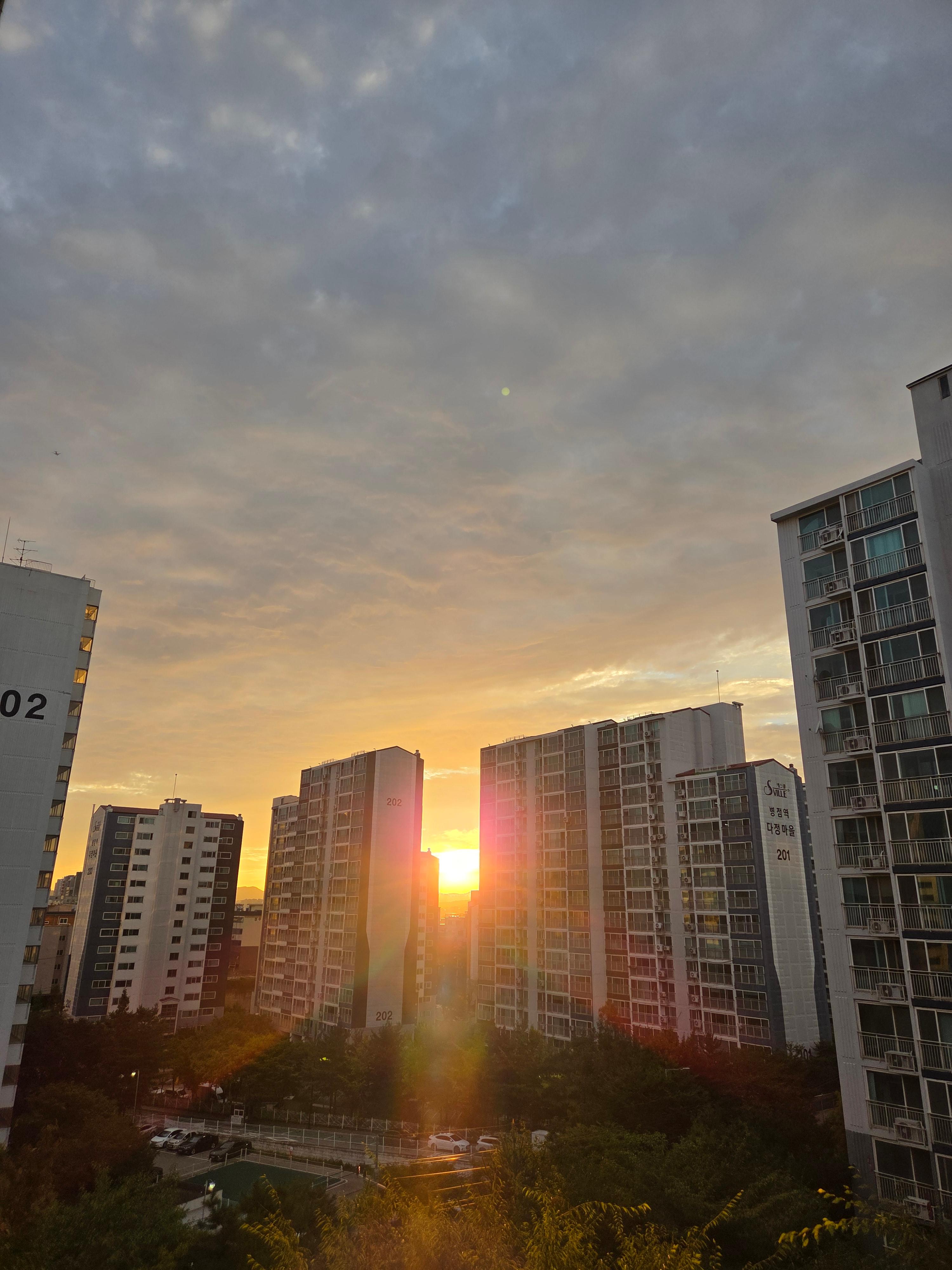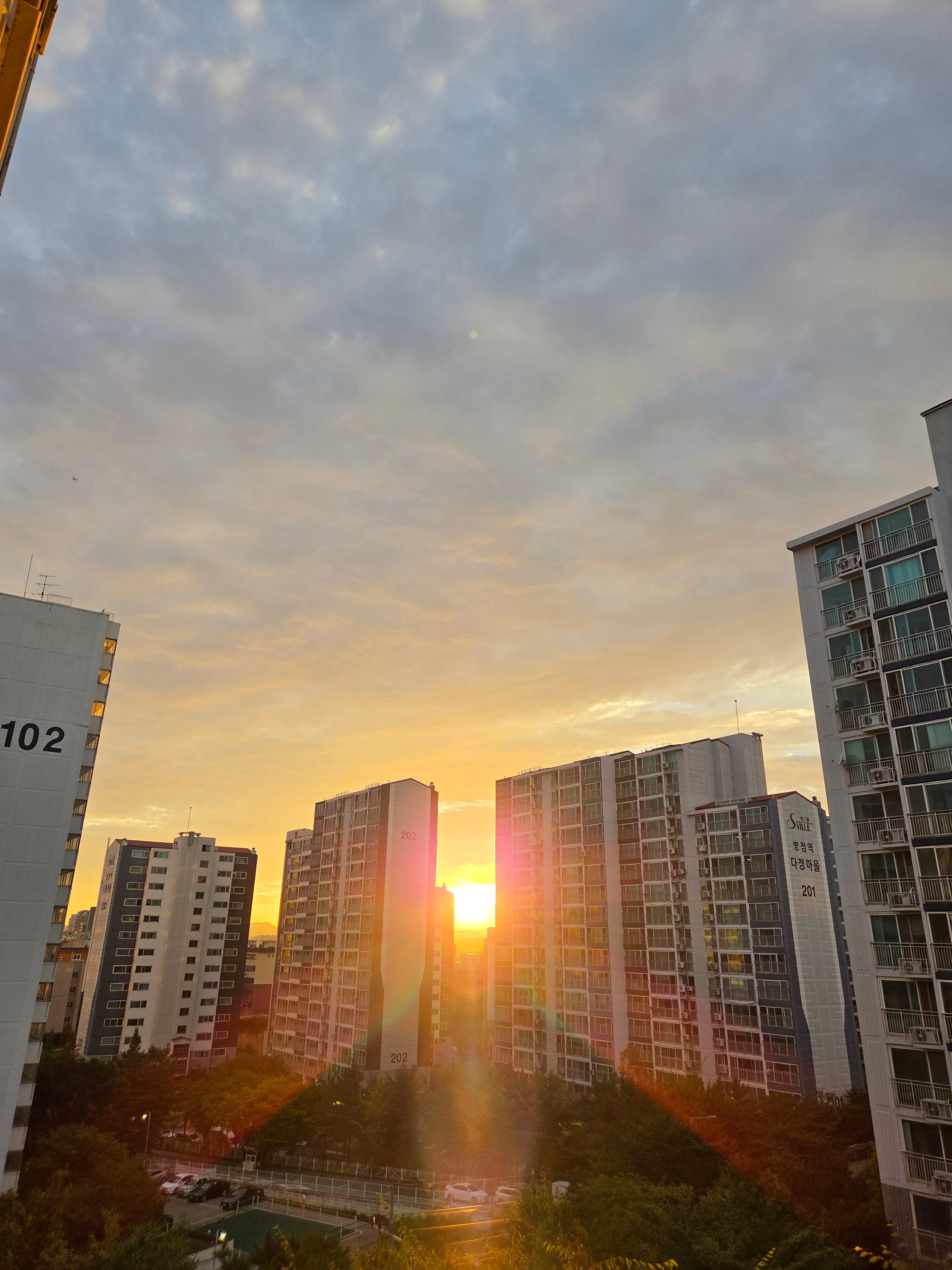 저 아파트 사이에 걸려있는 햇님의 멋진 노을풍경에